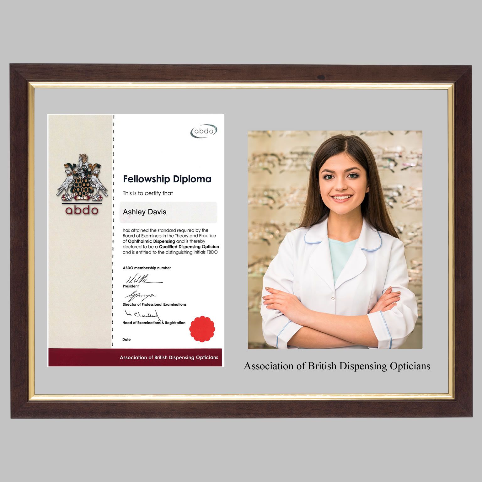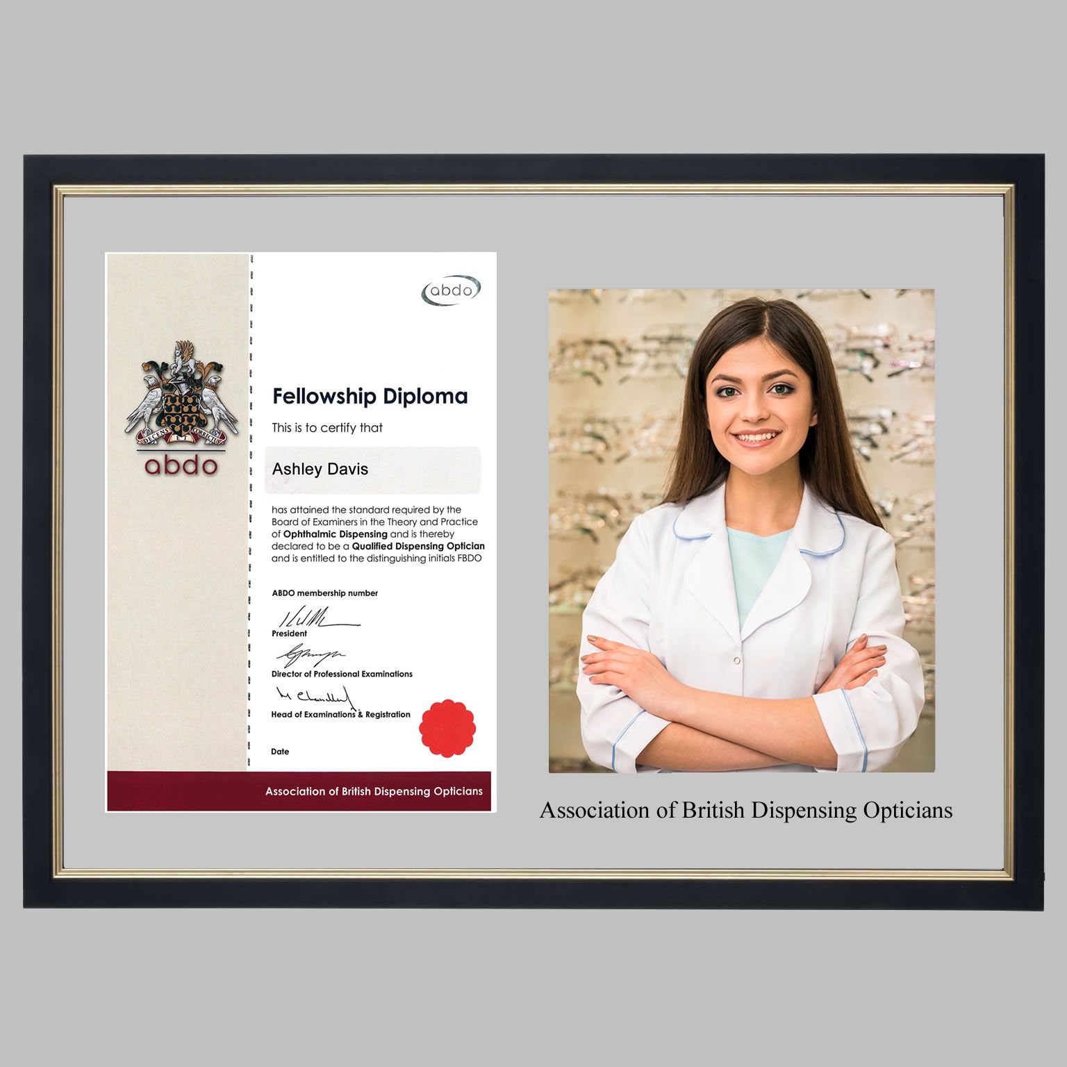 Your frame will be handmade in Great Britain to the highest standard using quality wooden frame moulding, featuring double pinned corners for strength and durability. A Dawn Grey mount will be custom-printed with ‘Association of British Dispensing Opticians’ using traditional hot foil printing on approved acid-free mount card. Your frame will then be fitted with antiglare shatter-resistant Plexiglass, ensuring your certificate and photo are displayed at their best, reducing the damaging effects of UV light.