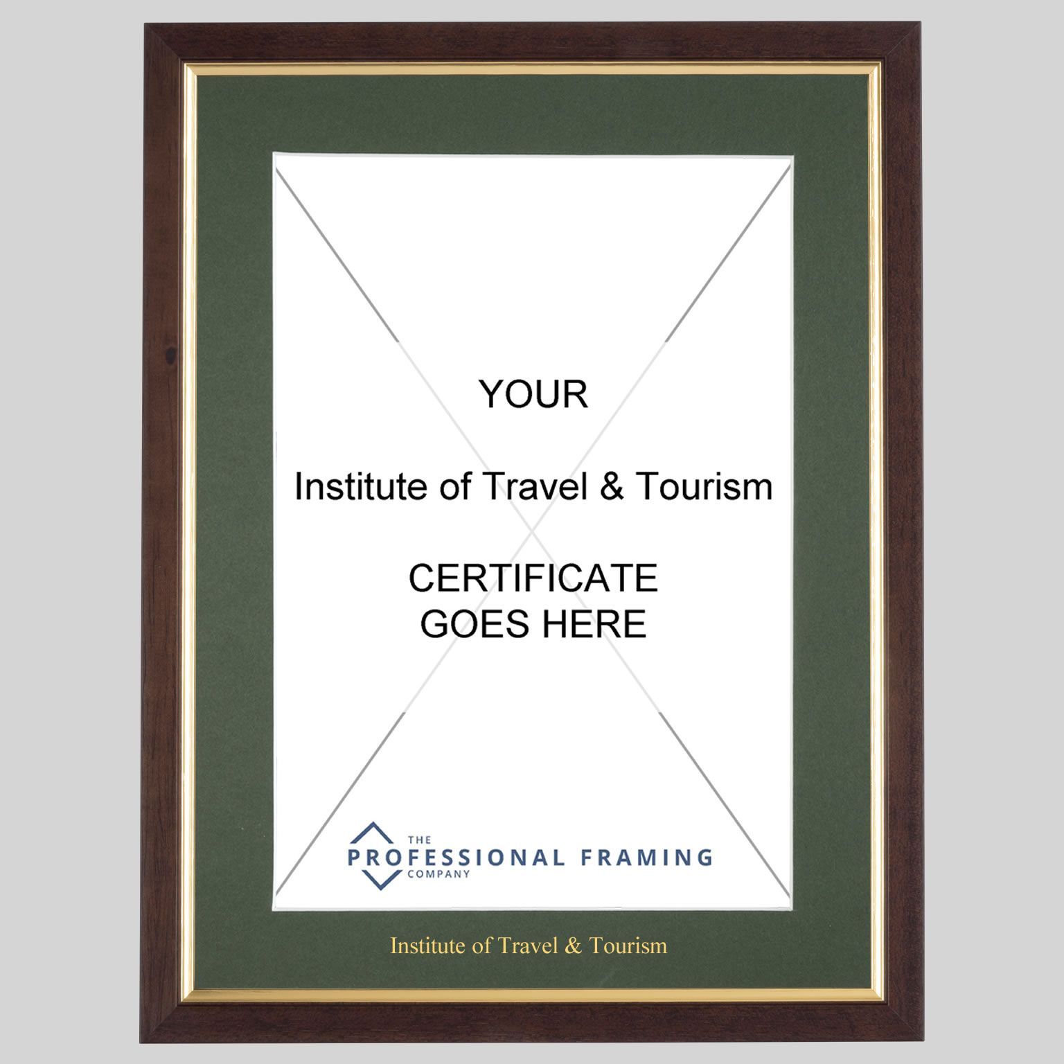 Your frame will be handmade in Great Britain – in your choice of colour – to the highest standard, using quality wooden frame moulding and featuring double-pinned corners for strength and durability. It will be fitted with antiglare Plexiglass, ensuring your portrait A4 graduation certificate is displayed at its best and reducing the damaging effects of UV light. Includes a unique mount, custom-printed with ‘Institute of Travel & Tourism’, using traditional hot foil printing on approved acid-free mount card. Removeable back-board allowing easy insertion and removal of your graduation certificate. Comes ready for wall hanging, and is suitable for the optional desk stand. See our hints and tips section for advice on putting your membership certificate into your frame. Overall frame dimensions are 293mm w x 380mm h