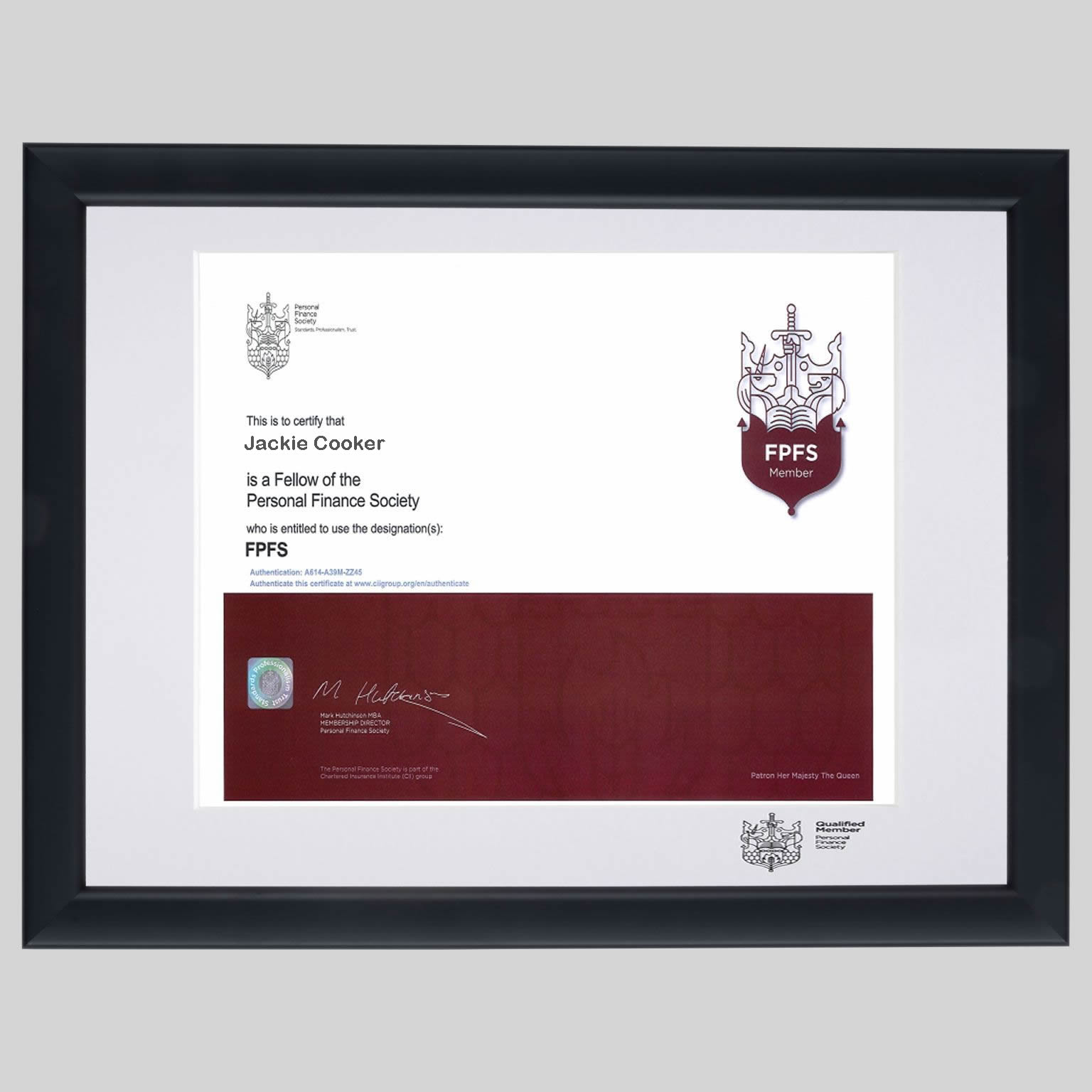Your frame will be handmade in Great Britain – in your choice of colour and to the highest quality using quality wooden frame moulding. Featuring double pinned corners for strength and durability – and fitted with top quality antiglare Plexiglass, ensuring your A4 Personal Finance Society certificate is displayed at its best and offering protection from the damaging effects of UV light. Removeable back-board allows for easy insertion and removal of your certificate. Ready for wall hanging, and is suitable for the optional desk stand. See our hints and tips section for advice on putting your certificate into your frame. Overall frame dimensions are 380mm w x 293mm h