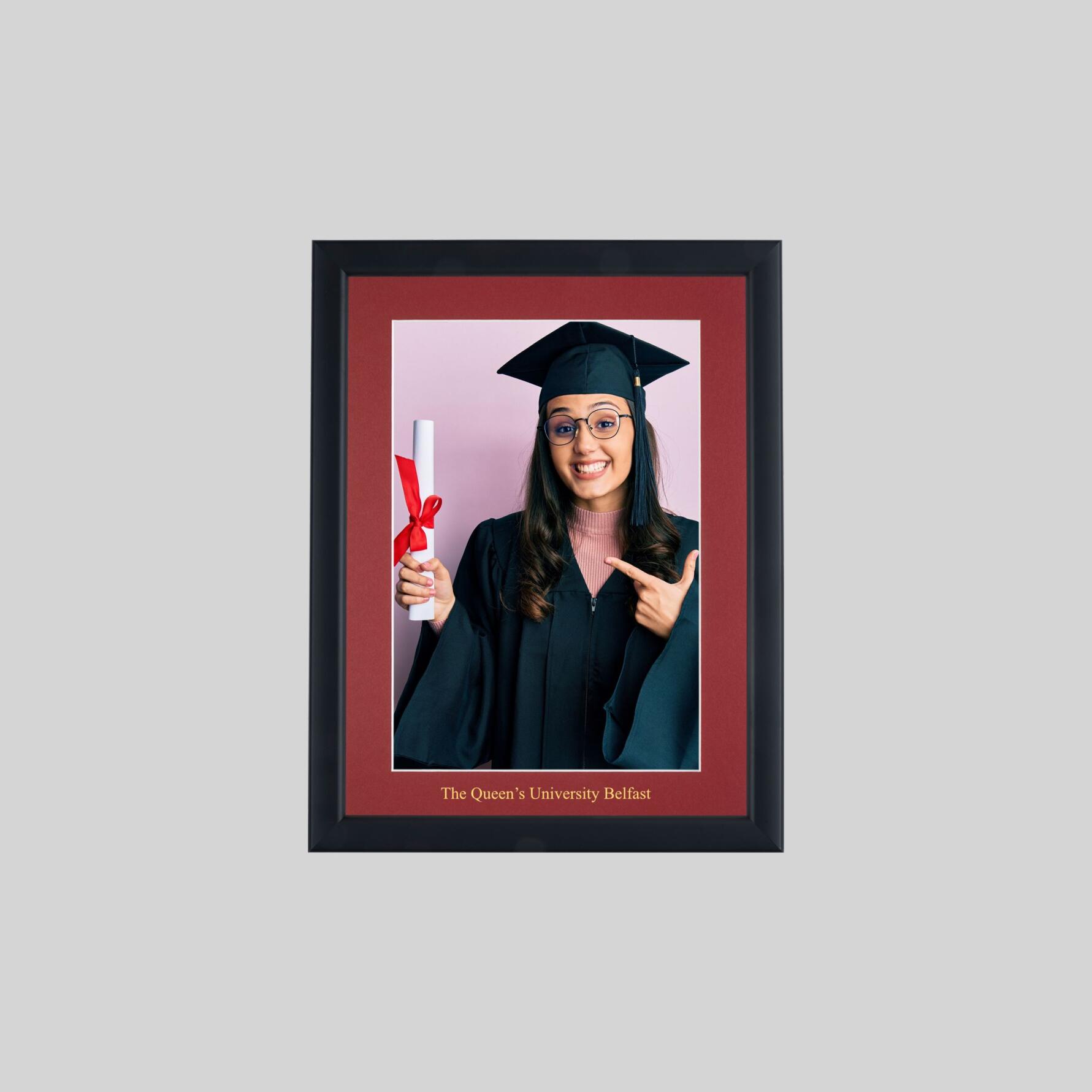 Your frame will be handmade in Great Britain – in your choice of colour – to the highest quality using quality wooden frame moulding, featuring double pinned corners for strength and durability – and fitted with top quality antiglare Plexiglass, ensuring your 6in x 4in graduation photograph is displayed at its best and reducing the damaging effects of UV light. Includes a unique Crimson coloured mount, custom-printed with ‘The Queen’s University Belfast’, using traditional hot foil printing on approved acid-free mount card. Removeable back-board allowing easy insertion and removal of your photograph. Comes ready for wall hanging. See our hints and tips section for advice on putting your photograph into your frame. Overall frame dimensions are 193mm w x 243mm h