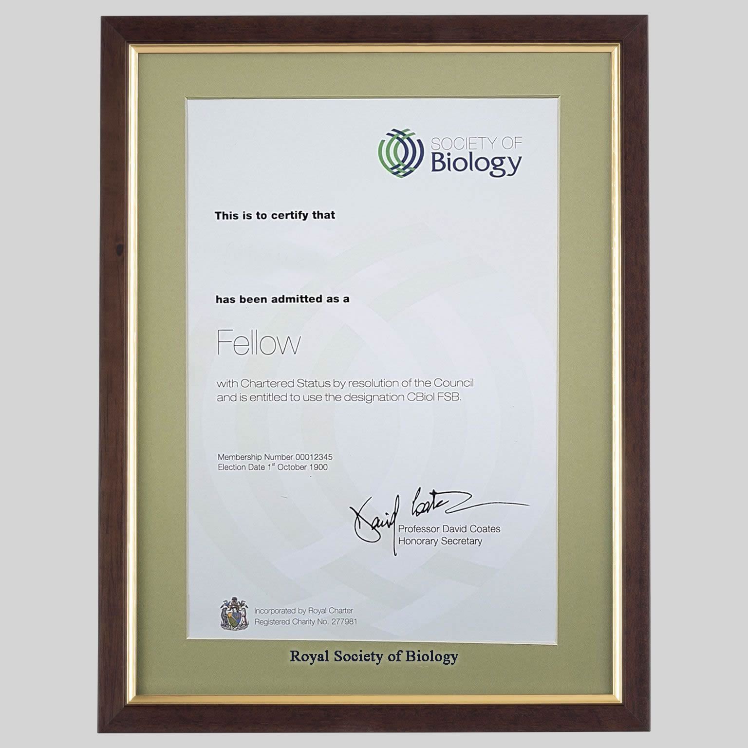 Your frame will be handmade in Great Britain – in your choice of colour and to the highest quality using quality wooden frame moulding. Featuring double pinned corners for strength and durability – and fitted with top quality antiglare Plexiglass, ensuring your A4 Royal Society of Biology certificate is displayed at its best and offering protection from the damaging effects of UV light. Removeable back-board allows for easy insertion and removal of your certificate. Ready for wall hanging, and is suitable for the optional desk stand. See our hints and tips section for advice on putting your certificate into your frame. Overall frame dimensions are 293mm w x 380mm h