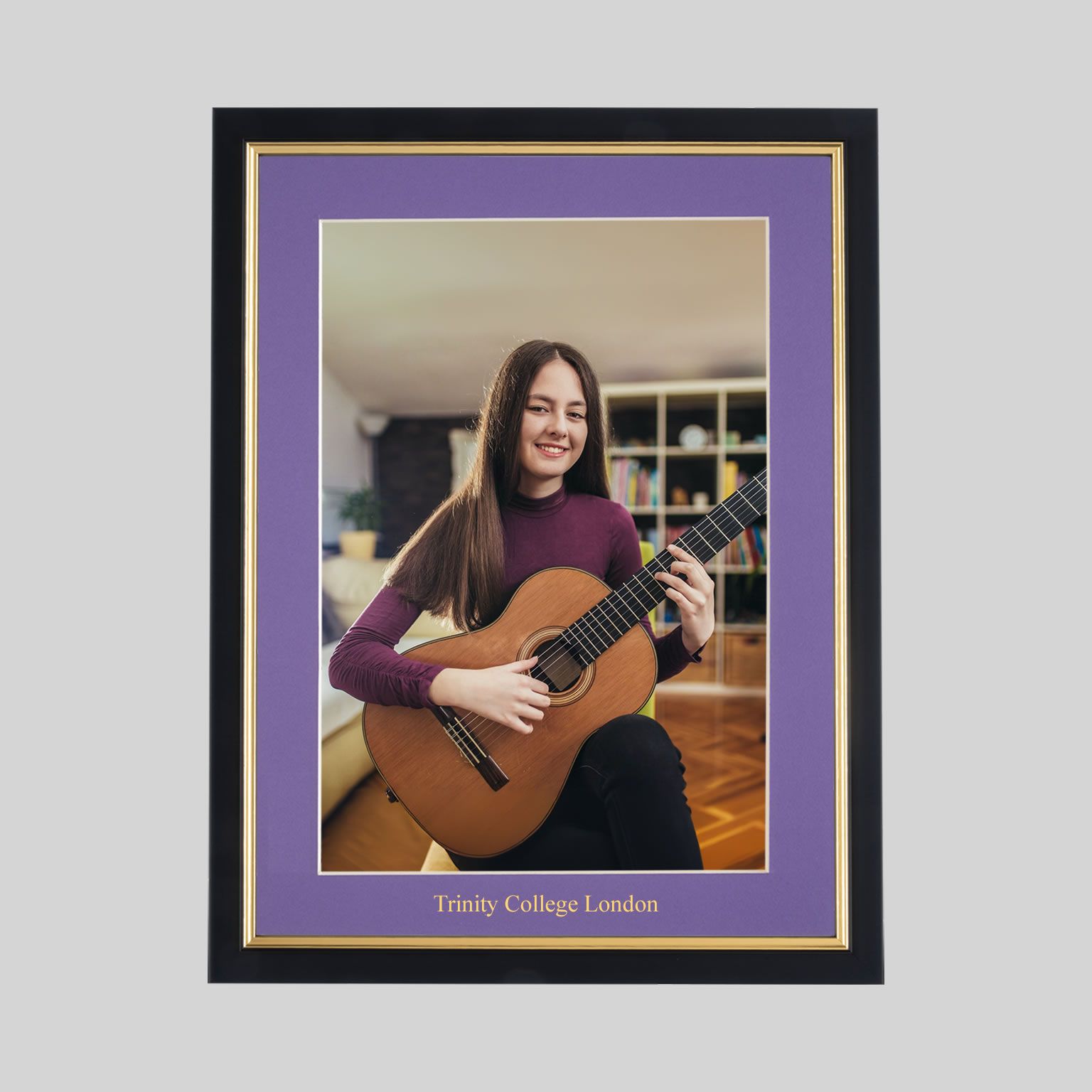 Your frame will be handmade in Great Britain – in your choice of colour – to the highest quality using quality wooden frame moulding, featuring double pinned corners for strength and durability – and fitted with antiglare Plexiglass, ensuring your photograph is displayed at its best and offering protection from the damaging effects of UV light.  A Grape coloured mount will be custom-printed with ‘Trinity College London’, using gold-coloured traditional hot foil printing.