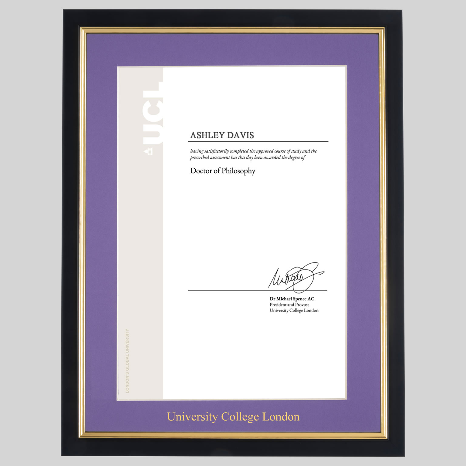 Your frame will be handmade in Great Britain – in your choice of colour – to the highest standard, using quality wooden frame moulding and featuring double-pinned corners for strength and durability. It will be fitted with antiglare Plexiglass, ensuring your portrait A4 graduation certificate is displayed at its best and reducing the damaging effects of UV light. Includes a unique mount, custom-printed with ‘University College London’, using traditional hot foil printing on approved acid-free mount card. Removeable back-board allowing easy insertion and removal of your graduation certificate. Comes ready for wall hanging, and is suitable for the optional desk stand. See our hints and tips section for advice on putting your graduation certificate into your frame. Overall frame dimensions are 293mm w x 380mm h