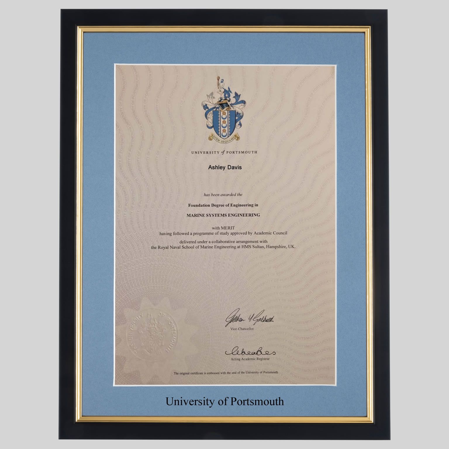 Your frame will be handmade in Great Britain – in your choice of colour – to the highest standard, using quality wooden frame moulding and featuring double-pinned corners for strength and durability. It will be fitted with antiglare Plexiglass, ensuring your portrait A4 graduation certificate is displayed at its best and reducing the damaging effects of UV light. Includes a unique mount, custom-printed with ‘University of Portsmouth’, using traditional hot foil printing on approved acid-free mount card. Removeable back-board allowing easy insertion and removal of your graduation certificate. Comes ready for wall hanging, and is suitable for the optional desk stand. See our hints and tips section for advice on putting your graduation certificate into your frame. Overall frame dimensions are 293mm w x 380mm h