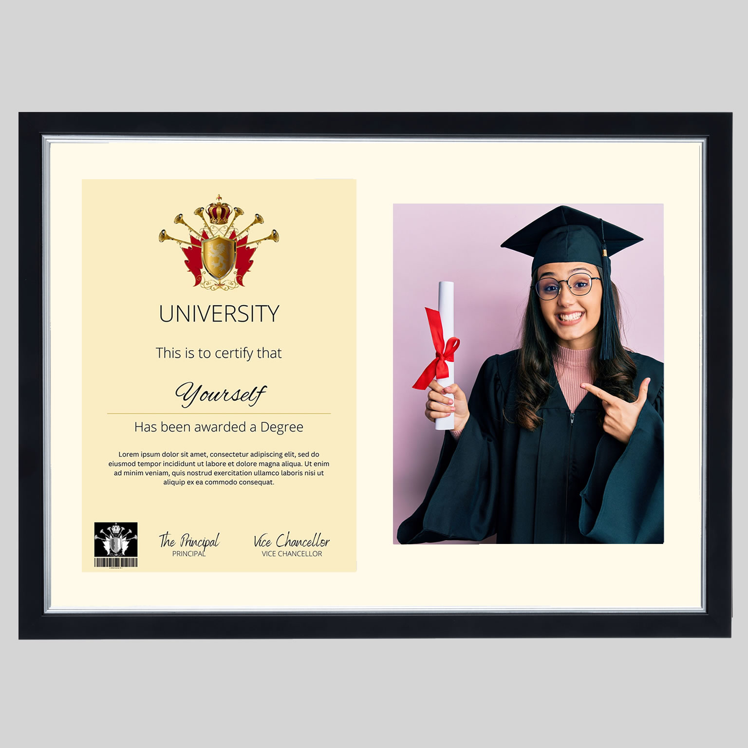 Your frame will be handmade in Great Britain to the highest standard using quality wooden frame moulding, featuring double pinned corners for strength and durability, an Antique White mount and fitted with antiglare shatter-resistant Plexiglass, ensuring your graduation certificate and photo is displayed at its best and reducing the damaging effects of UV light.