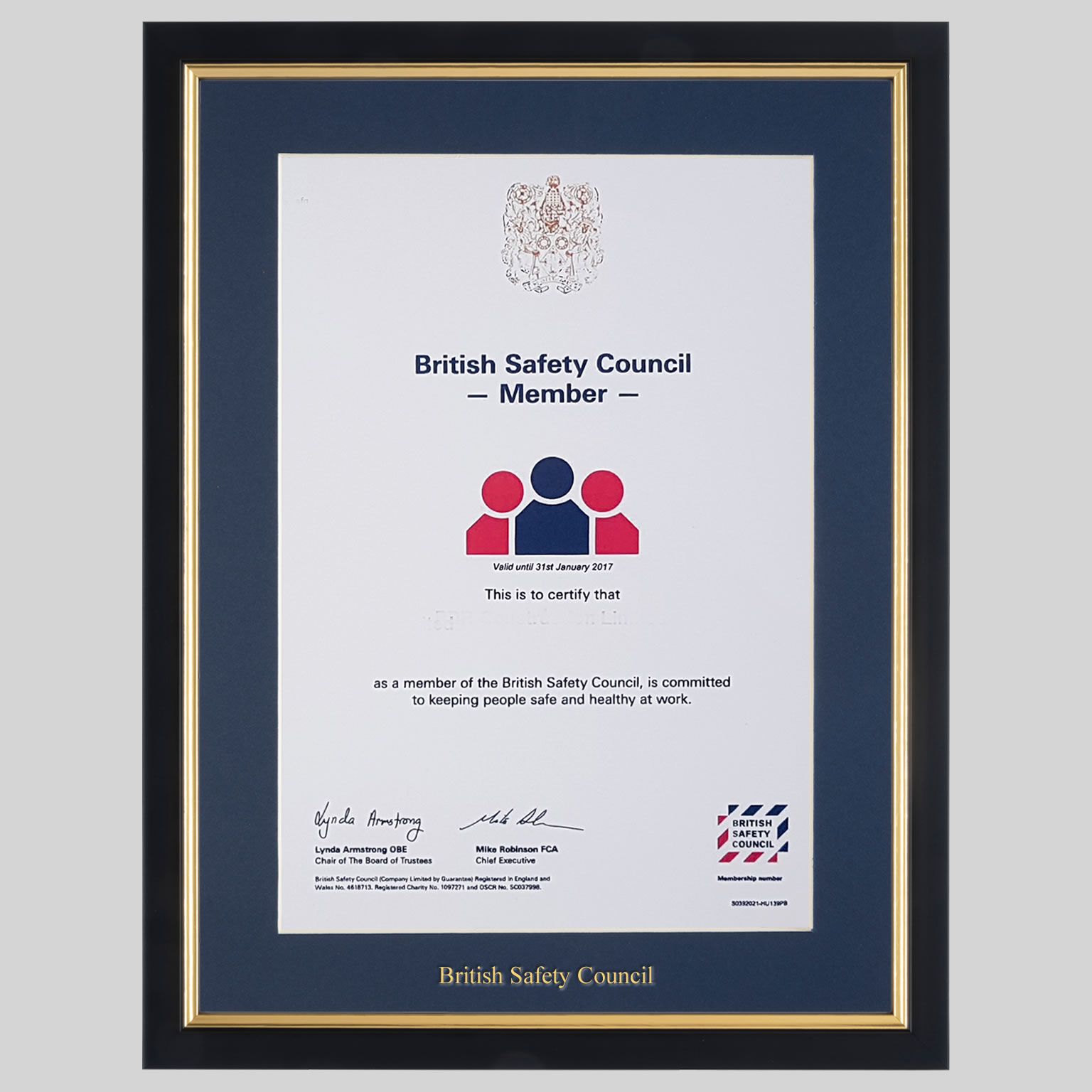 The frame includes a Pacific Blue coloured mount, embossed with ‘British Safety Council’ in Gold coloured lettering.