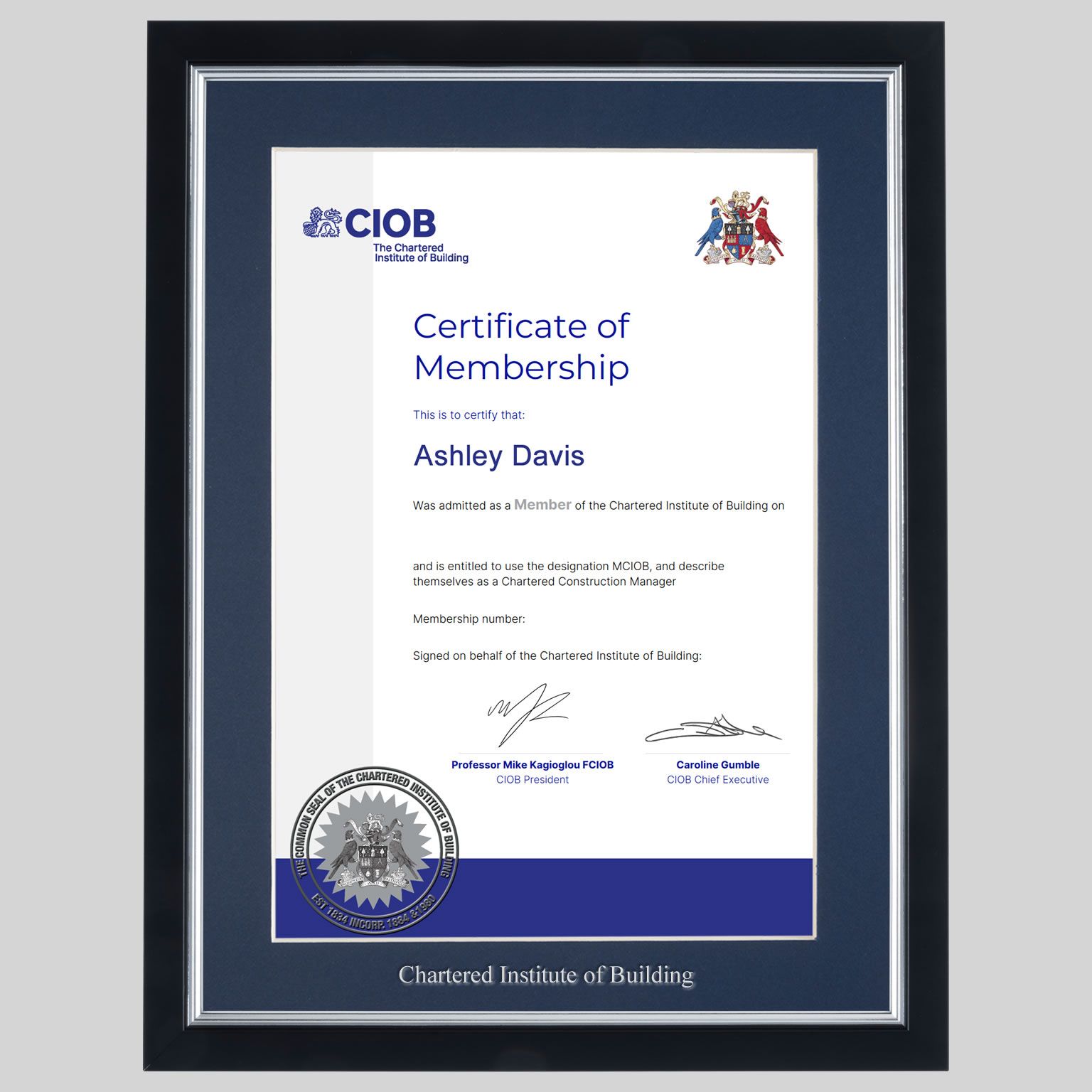 The frame includes a Blue coloured mount, embossed with ‘Chartered Institute of Building’ in Gold coloured lettering.