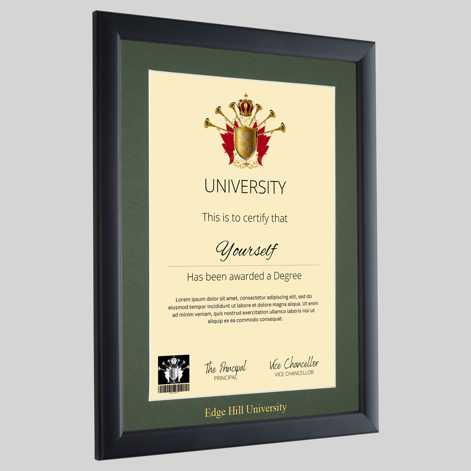 Your frame will be handmade in Great Britain – in your choice of colour – to the highest standard, using quality wooden frame moulding and featuring double-pinned corners for strength and durability. It will be fitted with antiglare Plexiglass, ensuring your portrait A4 graduation certificate is displayed at its best and reducing the damaging effects of UV light. Includes a unique mount, custom-printed with ‘Edge Hill University’, using traditional hot foil printing on approved acid-free mount card. Removeable back-board allowing easy insertion and removal of your graduation certificate. Comes ready for wall hanging, and is suitable for the optional desk stand. See our hints and tips section for advice on putting your graduation certificate into your frame. Overall frame dimensions are 293mm w x 380mm h