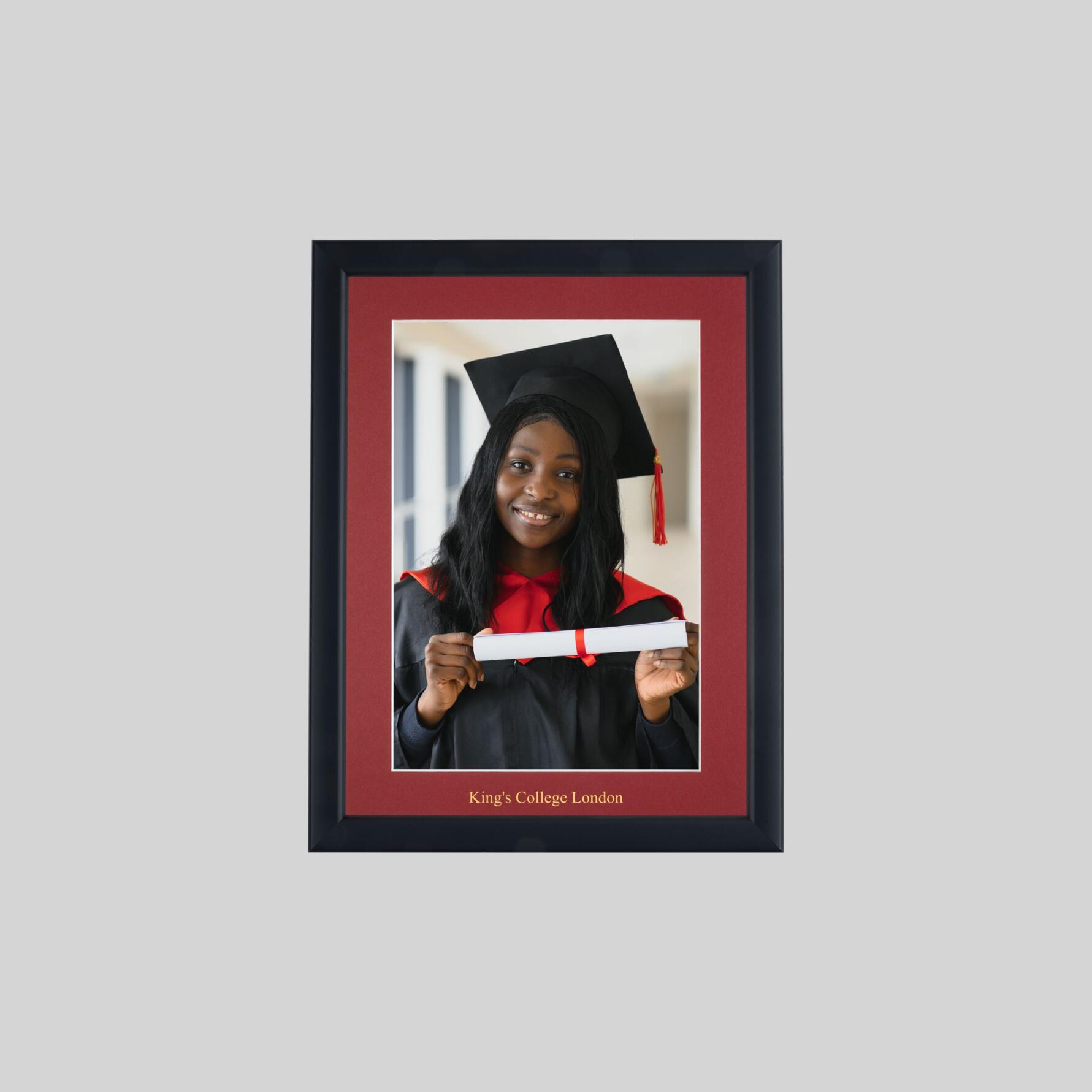 Your frame will be handmade in Great Britain – in your choice of colour – to the highest quality using quality wooden frame moulding, featuring double pinned corners for strength and durability – and fitted with top quality antiglare Plexiglass, ensuring your 6in x 4in graduation photograph is displayed at its best and reducing the damaging effects of UV light. Includes a unique crimson coloured mount, custom-printed with King’s College London, using traditional hot foil printing on approved acid-free mount card. Removeable back-board allowing easy insertion and removal of your photograph. Comes ready for wall hanging. See our hints and tips section for advice on putting your photograph into your frame. Overall frame dimensions are 193mm w x 243mm h