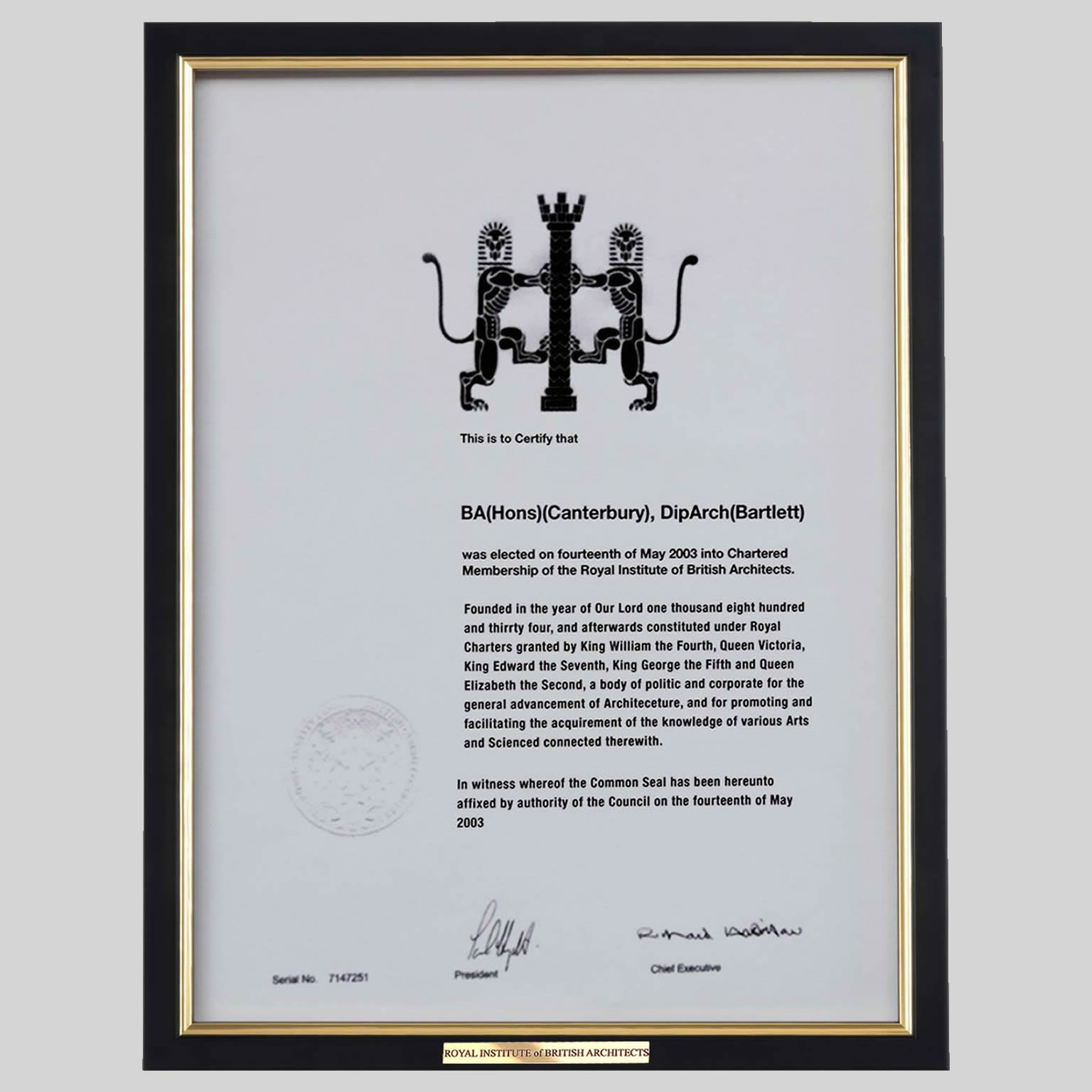 Your frame will be handmade in Great Britain – in your choice of colour and to the highest quality using quality wooden frame moulding. Featuring double pinned corners for strength and durability – and fitted with top quality antiglare Plexiglass, ensuring your A3 Royal Institute of British Architects certificate is displayed at its best and offering protection from the damaging effects of UV light. Removeable back-board allows for easy insertion and removal of your certificate. Ready for wall hanging. See our hints and tips section for advice on putting your certificate into your frame. Overall frame dimensions are 330mm w x 450mm h. Includes a brass or silver-coloured plaque engraved with “Royal Institute of British Architects”.