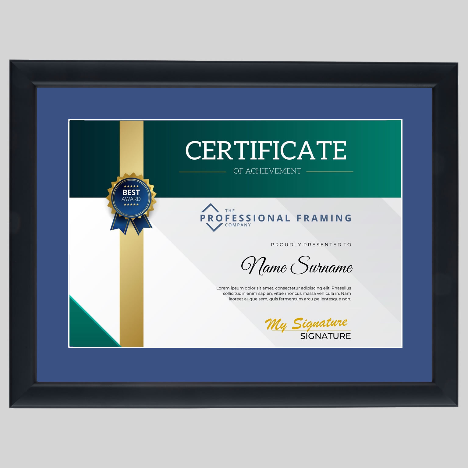 Your generic swimming Certificate Frame will be handmade in Great Britain to the highest standard using quality wooden frame moulding, featuring double pinned corners for strength and durability, will be fitted with your choice of mount colour and top quality antiglare Plexiglass, ensuring your Certificate or Award is displayed at its best and offering protection from the damaging effects of UV light.