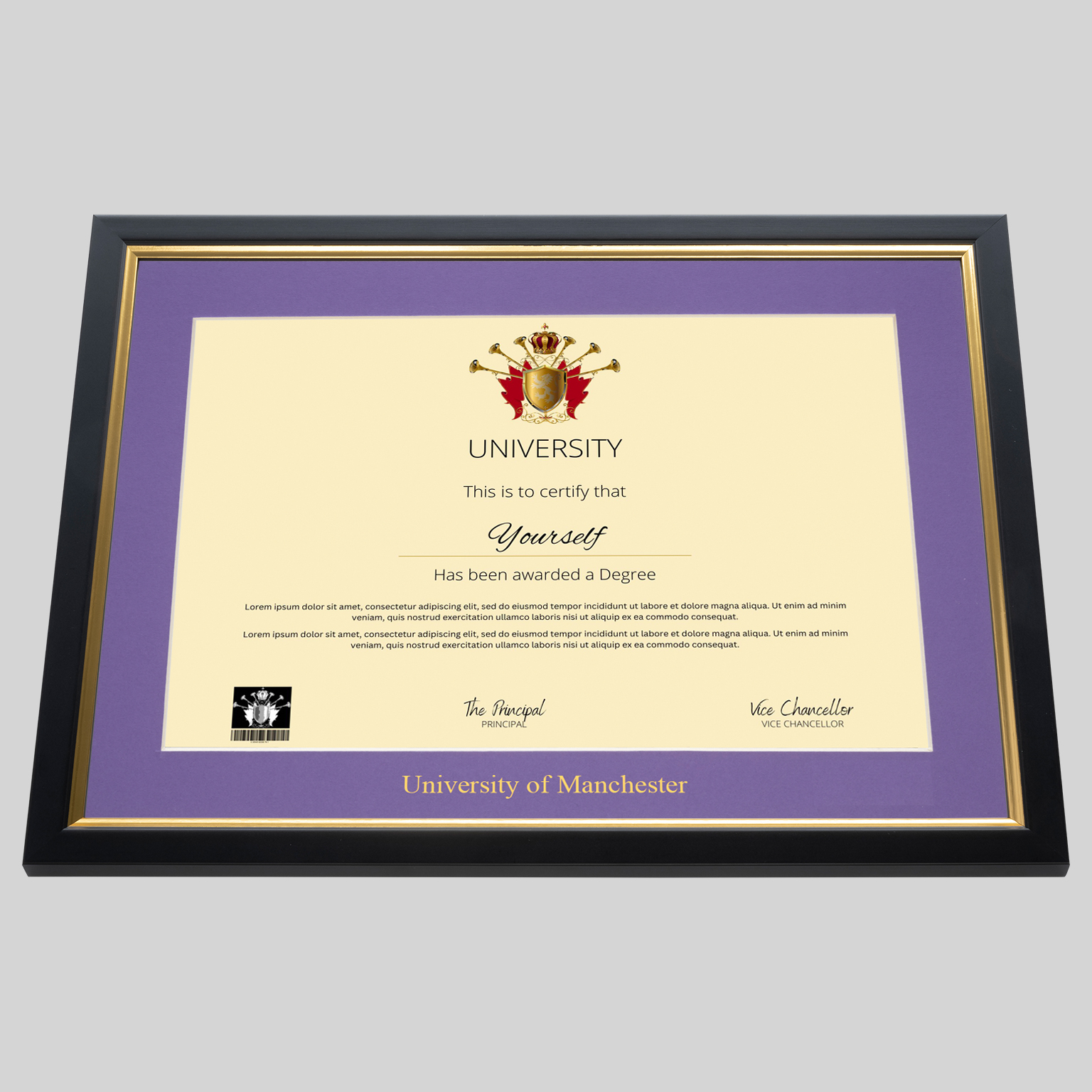 Your frame will be handmade in Great Britain – in your choice of colour – to the highest standard, using quality wooden frame moulding and featuring double-pinned corners for strength and durability. It will be fitted with antiglare Plexiglass, ensuring your landscape A4 graduation certificate is displayed at its best and reducing the damaging effects of UV light. Includes a unique mount, custom-printed with ‘University of Manchester’, using traditional hot foil printing on approved acid-free mount card. Removeable back-board allowing easy insertion and removal of your graduation certificate. Comes ready for wall hanging, and is suitable for the optional desk stand. See our hints and tips section for advice on putting your graduation certificate into your frame. Overall frame dimensions are 380mm w x 293mm h