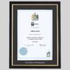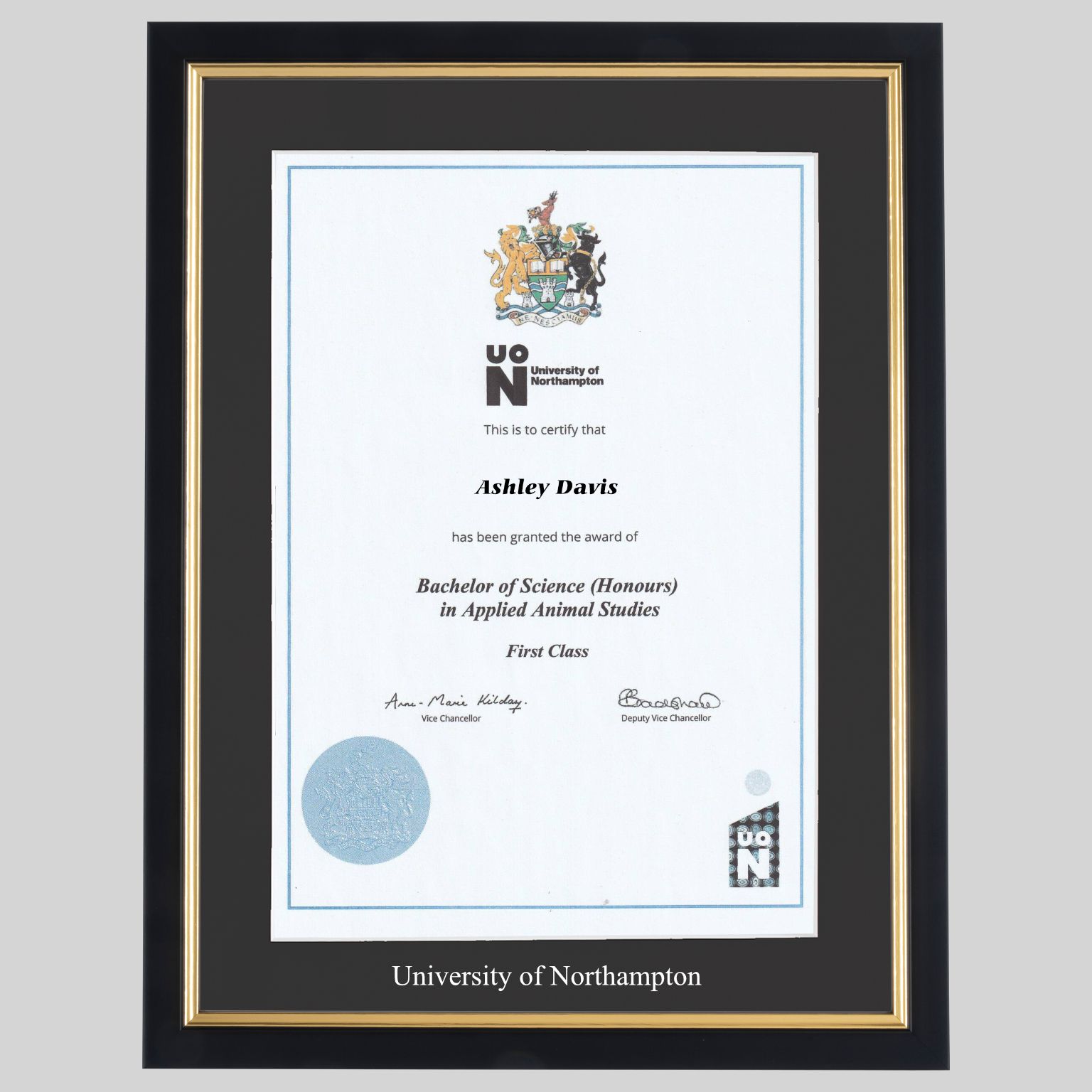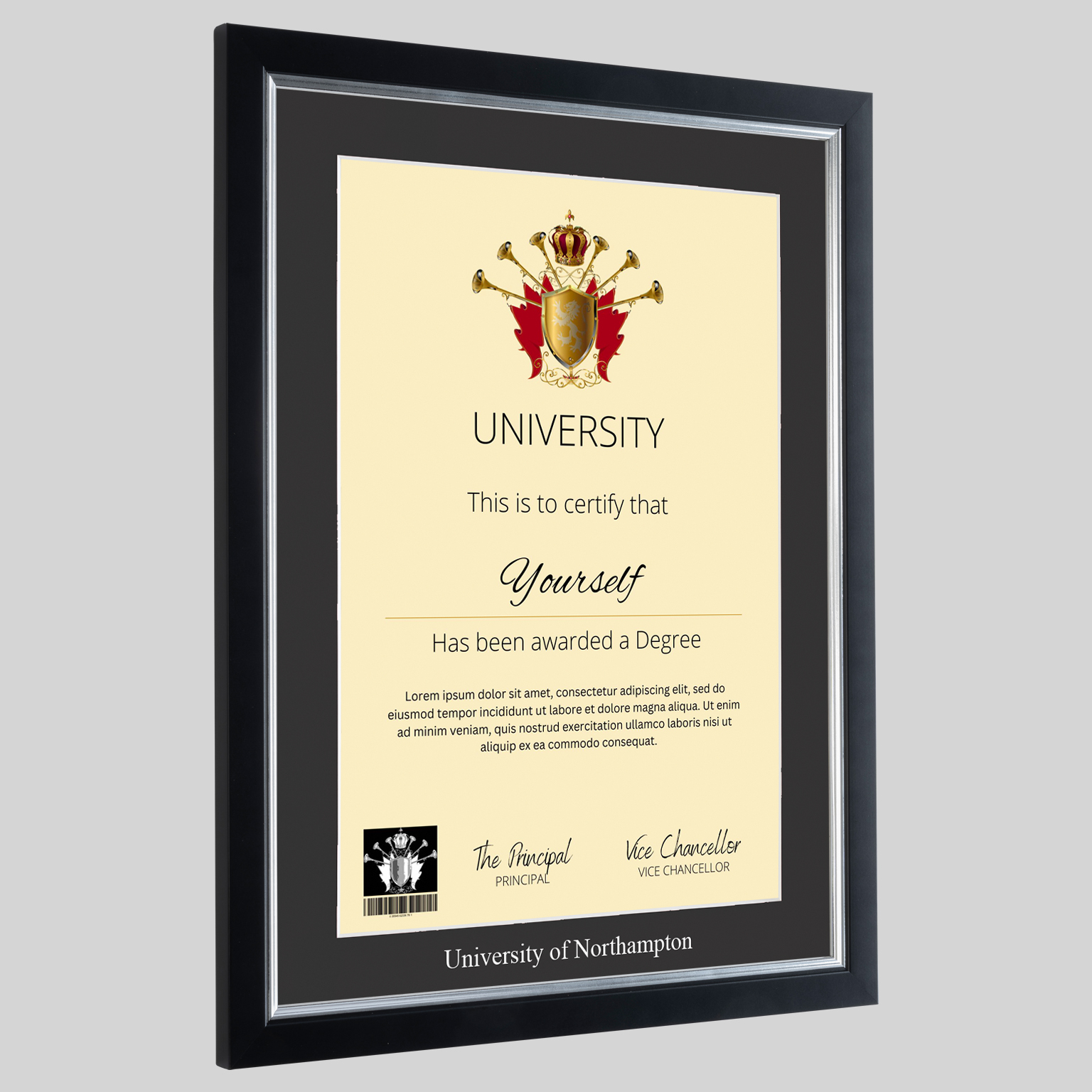Your frame will be handmade in Great Britain – in your choice of colour – to the highest standard, using quality wooden frame moulding and featuring double-pinned corners for strength and durability. It will be fitted with antiglare Plexiglass, ensuring your portrait A4 graduation certificate is displayed at its best and reducing the damaging effects of UV light. Includes a unique mount, custom-printed with ‘University of Northampton’, using traditional hot foil printing on approved acid-free mount card. Removeable back-board allowing easy insertion and removal of your graduation certificate. Comes ready for wall hanging, and is suitable for the optional desk stand. See our hints and tips section for advice on putting your graduation certificate into your frame. Overall frame dimensions are 293mm w x 380mm h
