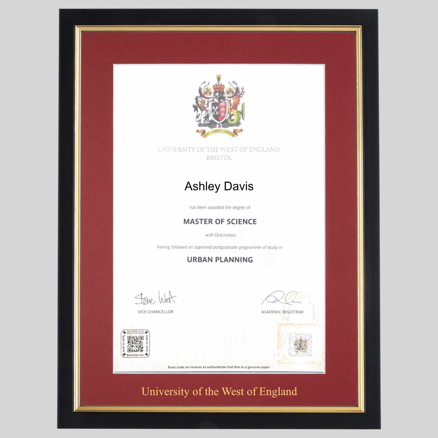 Your frame will be handmade in Great Britain – in your choice of colour – to the highest standard, using quality wooden frame moulding and featuring double-pinned corners for strength and durability. It will be fitted with antiglare Plexiglass, ensuring your portrait A4 graduation certificate is displayed at its best and reducing the damaging effects of UV light. Includes a unique mount, custom-printed with ‘University of the West of England’, using traditional hot foil printing on approved acid-free mount card. Removeable back-board allowing easy insertion and removal of your graduation certificate. Comes ready for wall hanging, and is suitable for the optional desk stand. See our hints and tips section for advice on putting your graduation certificate into your frame. Overall frame dimensions are 293mm w x 380mm h