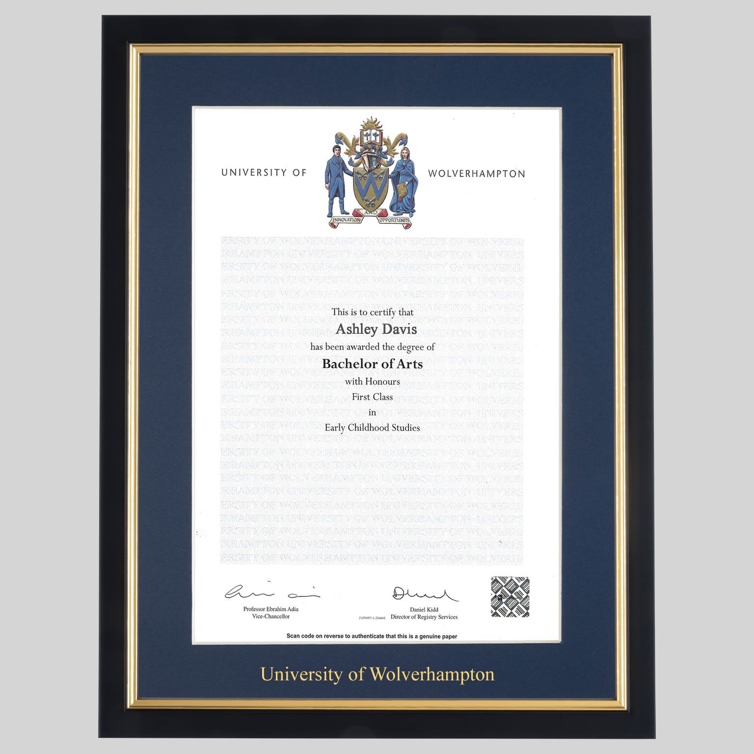 Your frame will be handmade in Great Britain – in your choice of colour – to the highest standard, using quality wooden frame moulding and featuring double-pinned corners for strength and durability. It will be fitted with antiglare Plexiglass, ensuring your portrait A4 graduation certificate is displayed at its best and reducing the damaging effects of UV light. Includes a unique mount, custom-printed with ‘University of Wolverhampton’, using traditional hot foil printing on approved acid-free mount card. Removeable back-board allowing easy insertion and removal of your graduation certificate. Comes ready for wall hanging, and is suitable for the optional desk stand. See our hints and tips section for advice on putting your graduation certificate into your frame. Overall frame dimensions are 293mm w x 380mm h